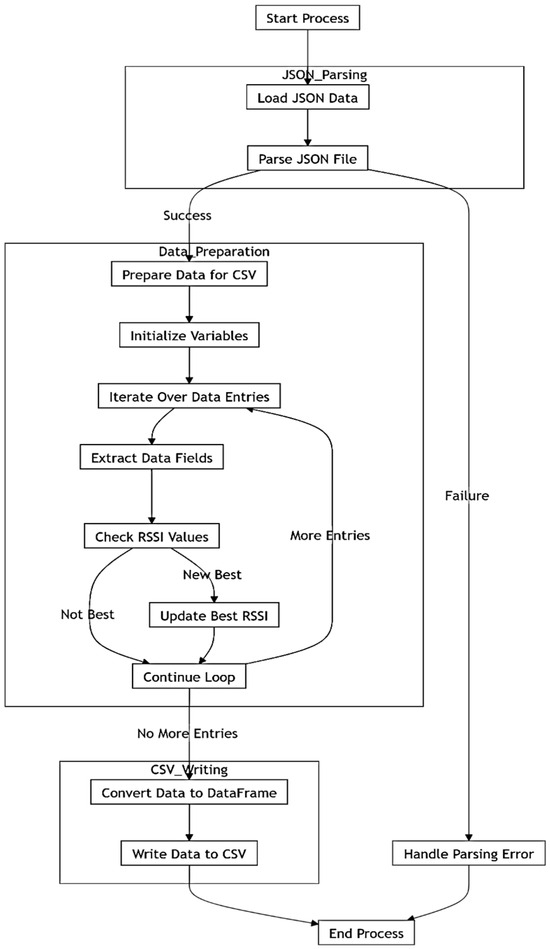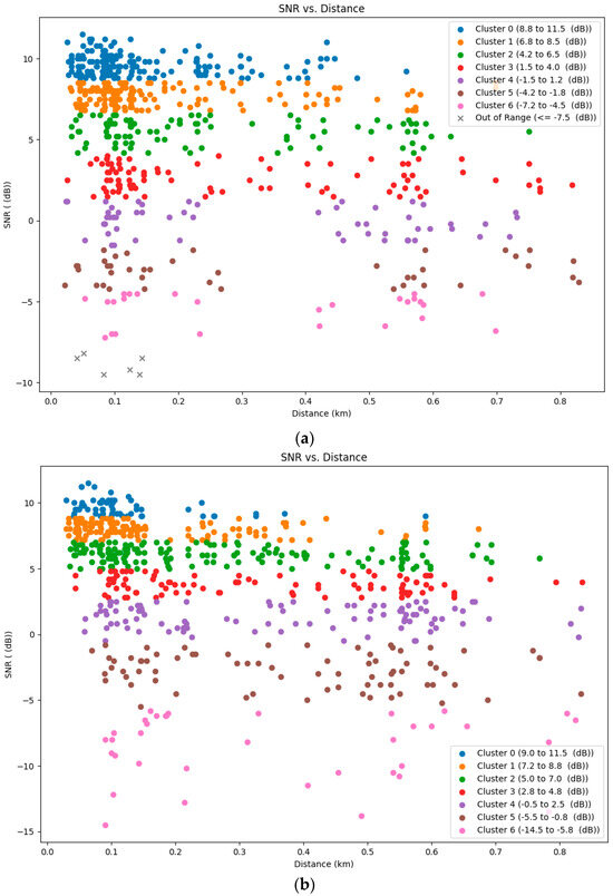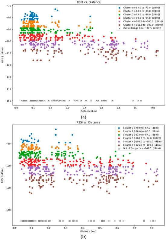 - Step 3: Data Collection and Preprocessing: In the data collection and preprocessing phase, payload decoding was performed using custom payload formatter in JavaScript, and after that, JSON data was parsed from TTN using Python scripts (PyCharm 2023.2) extracting key metrics, such as RSSI, SNR, GPS, and packet loss. The geodesic distance between devices and gateways was calculated using the geopy library to ensure precise localization. Additionally, K-means clustering was applied, with six clusters for RSSI and seven for SNR, to classify signal quality and analyze network performance more effectively.