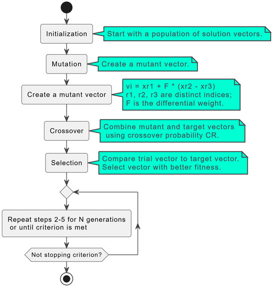 | Algorithm 1: Hybrid Particle Swarm Optimization + Differential Evolution (PSO + DE) | ||