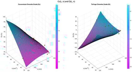 Simulated surface showing the Cr2O3 content in concentrate () and tailings ().