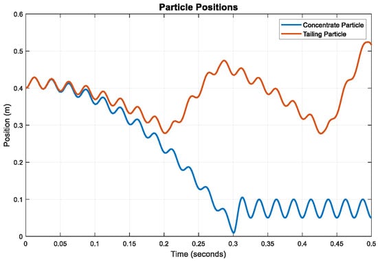 Although the regression model captures empirical relationships, a physics-based particle motion model is required to understand the underlying separation dynamics. This section introduces a mathematical model that describes the motion of chromite concentrate and waste rock particles within the pulsating gravity field of a jigging machine [22]. The primary objective is to analyze the influence of pulsation frequency on the trajectories of particles with varying densities and sizes.