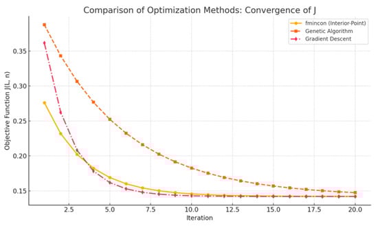 Among the available solvers, the Interior-Point method was selected due to its robustness in constrained nonlinear problems. Figure 8 shows the results of a comparison of three optimization methods (Interior-Point, Genetic Algorithm, and Gradient Descent) in terms of speed and nature of convergence of the objective function .
