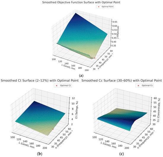 The surface shows that at low bed level values and high pulsation frequency values, chromium losses increase, which is due to the deterioration of particle separation conditions. The optimum control point, marked on the graph, corresponds to the combination of parameters at which chromium losses are minimal—this is evident from the lowest value and the highest value in this region. A clearly defined minimum on the surface of the objective function indicates the existence of a region of optimal parameters, which confirms the effectiveness of the selected model and the applied optimization method.