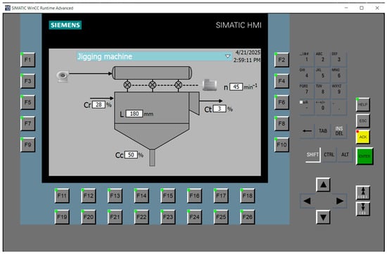 The developed hybrid control system was tested under simulation conditions and in a digital twin environment. The HMI, developed in the SIMATIC WinCC environment, allows visualization of the control process, analysis, and archiving of the settling process parameters (see Figure 10). This makes the system suitable for industrial integration as part of new-generation digital solutions.