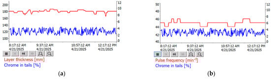 The graph shows the dependence of the chromium content in tailings on the bed thickness and the pulsation frequency. With a relatively stable bed thickness (red line), the chromium content in tailings (blue line) remains within the permissible range, not exceeding . This indicates the correct operation of the control system and the efficiency of the optimization algorithm used. With minor fluctuations in the pulsation frequency in the range of (red line), stabilization of the chromium content in the tailings at a level of (blue line) is observed, which indicates the effective operation of the control algorithm and the ability of the system to maintain the specified beneficiation mode.