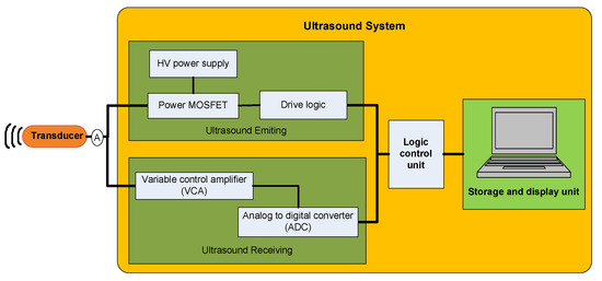 Ultrasound waves are produced by transducers activated at frequencies above 20 kHz, which is commonly accepted as the upper frequency limit of human hearing. Figure 1 shows a typical ultrasound hardware system, which mainly consists of a transducer, an ultrasonic pulse transmitter, a receiver, a logic control unit, a storage system, and a display unit [40].