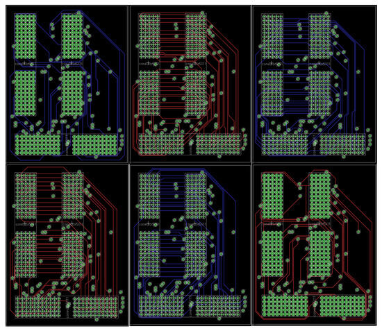 Initially, an inspection is conducted to understand the electronic configuration connecting the transducer to the ultrasound system. The transducer connection port on the equipment contains 110 pins which transmit electrical signals between components. For the design of the proposed electronic interface, it is essential to determine the pin configuration and the type of signals each pin carries. The design process began with the development of the printed circuit board (PCB) that constitutes the proposed electronic interface. This PCB features three 110-pin connectors and 220 laminated conductive tracks that provide interconnection between the ports. Figure 3 and Figure 4 display the six layout layers, each showing the routing of approximately 36 tracks per layer for port interconnection. The tracks are evenly distributed, which is critical to ensure optimal performance and to avoid any signal distortion or interference with the medical ultrasound system due to electromagnetic incompatibility between components [43,44]. Table 1 presents the technical and manufacturing specifications of the PCB.