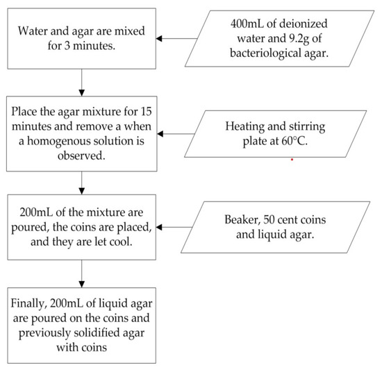 Figure 6 presents a diagram of the preparation method for 400 mL of agar-based gel. The procedure requires 400 mL of deionized water and powdered agar. Initially, 400 mL of deionized water and 9.2 g of agar are poured into a beaker. The water and agar are then mixed for approximately 3 min, after which the mixture is placed on a heating and stirring plate at 60 °C for 15 min, or until a homogeneous solution is observed. From the homogeneous mixture, 200 mL are poured into a separate beaker and allowed to cool for 5 min at room temperature (25 °C). Five coins are then positioned vertically in the solidified agar. The remaining liquid agar is poured over the beaker containing the embedded coins and left to cool for 5 min at room temperature, or alternatively, the beaker can be covered and refrigerated. Finally, the transducer of the ultrasound system is mounted on a universal stand above the prepared tissue emulator and adjusted until the coin images become visible on the ultrasound display.