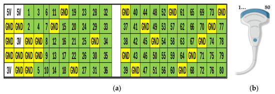To evaluate the acquired signals, measurements were carried out using an oscilloscope connected to the port of the electronic interface positioned between the ultrasound system and the transducer. The oscilloscope used was a UNI-T UPO1202CS model, featuring a sampling rate of 1 GS/s. Among the 110 pins monitored on the electronic interface, 80 were identified as ultrasonic signal lines corresponding to each piezoelectric element in the transducer connected to the system. Additionally, 26 pins were identified as ground reference signals (GND), 2 pins carried 5 V DC signals, and 2 pins carried 3 V DC signals. Figure 7 illustrates the pin configuration of the electronic interface port, with each signal numbered consecutively to indicate its correspondence to the individual transducer elements (a) that comprise the ultrasound sensor (b) within the system.