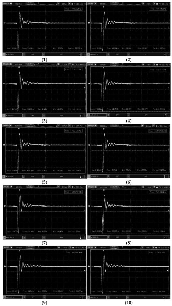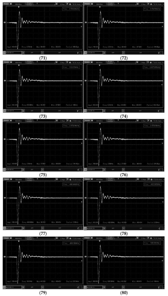 Figure 8 shows the acquired signals corresponding to piezoelectric transducers numbered 1 through 10. These signals clearly exhibit both the transmission and the reception of the ultrasound echo. The measurements were obtained using a conventional probe with no attenuation adjustment, set at 20 volts/div. The transmission pulses reached amplitudes of up to 150 volts, while the echo signals displayed varying amplitudes at a frequency of 3.5 MHz. The amplitude of the echo signals ranged from approximately 200 mV to 1.84 V.