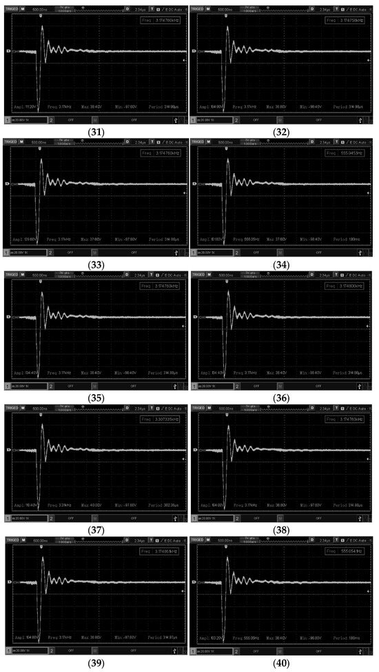 Figure 9 displays the acquired signals from piezoelectric transducers numbered 31 through 40. These signals show both the transmission and reception of ultrasound echoes. The measurements were taken using a conventional probe without attenuation adjustment, set at 20 volts/div. The transmitted signals reached amplitudes of up to 150 volts, while the echoes exhibited varying amplitudes at a frequency of 3.5 MHz. The amplitude of the echo signals ranged from approximately 400 mV to 1.6 V.