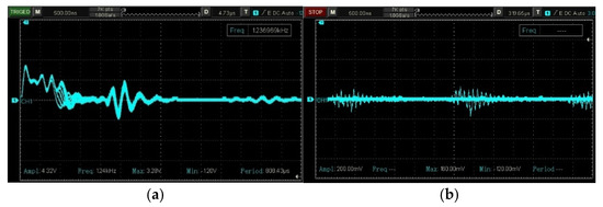 Figure 12 shows a magnified view at the focal distance of the image obtained from Signal 9 using a conventional probe without attenuation adjustment, set at 2 volts/div. In Figure 12a, it can be observed that the first echo has an amplitude of 1.8 V, while the second echo measures 400 mV. These low-amplitude echo signals are accompanied by high-frequency noise propagating through the ultrasound system’s electronic circuitry. As depicted in Figure 12b, the noise signal was captured using a conventional probe without attenuation adjustment, set at 1 volt/div. This GND signal illustrates how noise propagates within the system, with amplitudes ranging from 80 mV to 1.84 V. Low-amplitude echo signals combined with high-frequency noise are often either suppressed or amplified during signal processing via digital filtering algorithms. This process degrades image quality and simultaneously discards diagnostically relevant information for medical image reconstruction, ultimately reducing the effectiveness of timely medical diagnoses.