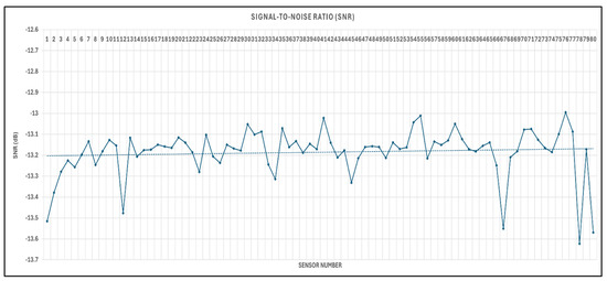 Signal-to-noise ratio graph of the 80 sensors in dB.
