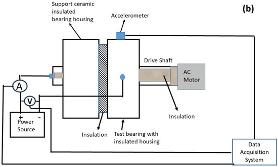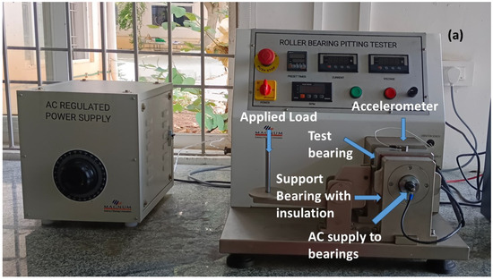 Figure 1a indicates the full-bearing test rig (Make: Magnum Engineers, Bangaluru, India) used in this work. The test rig is installed at the Tribology and Interactive Surfaces Research Laboratory (TRISUL), Amrita Vishwa Vidyapeetham, Chennai, India. Greases (5.0 ± 0.5 g) were filled into the gaps between the balls of the test bearing. To ensure a uniform grease distribution, the bearing was rotated freely before fixing it in the bearing test rig. Figure 1b shows the schematic diagram of the bearing test rig. An alternating electric current (starting at 10 A) was passed through the deep groove ball bearing mounted on a shaft. The bearing was rotated at 2000 rpm. A radial load of 496 N was applied to the bearing. An alternating current of 10 A was passed through the outer ring to the inner ring. To the best of the authors’ knowledge, bearing failures under high loads and high alternating current have not been systematically studied. Previous studies on conductive greases have indicated that a minimum 6 A is required for the formation of fluting marks [45]. However, to evaluate the grease performance under more extreme conditions, a current of 10 A was selected for the present work. The test equipment was supplied with 220 V and 50 Hz frequency. A ceramic bearing to support the shaft was used, as seen in Figure 1. The equipment used a high-class industrial grade insulator (Hylem) to prevent damage to the other parts of the equipment, except the test bearing. The radial vibrations caused due to the deterioration of the bearing raceways were picked up by an accelerometer (Make: PCB (Depew, NY, USA), Model: 333B30) fixed at the top of the bearing housing. Each set of experiments was repeated twice, and a fresh bearing was used every time. The average of the results has been presented in this work.