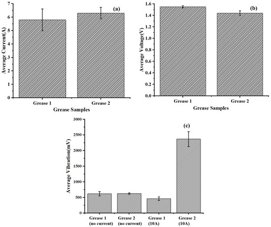 Comparing the greases based on various performance parameters: (a) average current; (b) average voltage; (c) average vibrations.