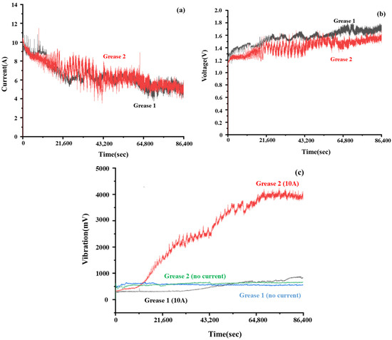 Parameters vs. time graphs of greases during testing: (a) current; (b) voltage; (c) vibration.