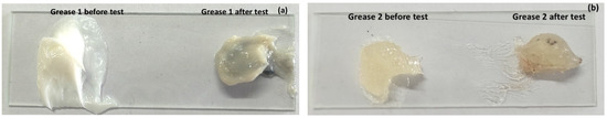 Discoloration of greases after tests with electric current: (a) Grease 1; (b) Grease 2.