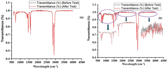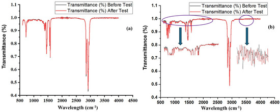 FTIR spectrographs of grease after test without current. (a) Grease 1; (b) Grease 2.