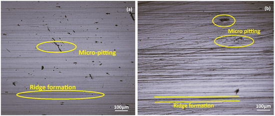 To understand the microstructural and surface damages, the bearing raceways were analyzed using an optical microscope. Figure 7 indicates the surface damage of the bearing raceways, which were running without the presence of an electric current. Micro-pittings and ridge formation were common on the raceways while using both types of grease.