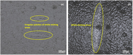 On further exploration of the damages on the bearing raceways by analyzing the microstructure of the bearing raceways (Figure 8), irregular white etching areas (WEA) were observed on the surface of the bearing raceways under electrified conditions. Bai et al. [48] reported that these irregular WEAs result from the randomized movement of carbides, overloads, or local heating. These WEAs are microstructural alterations of steel that appear white under an optical microscope after etching. As seen in Figure 8, a difference in the microstructure was observed between Grease 1 and Grease 2 under the same magnification. The electric current passing through the bearings resulted in a severe change in the microstructure. The microstructure of the bearing with Grease 2 was much deteriorated as compared to Grease 1. The formation of WEAs was further confirmed by measuring the WEAs’ hardness and the surrounding areas. A fresh bearing race way exhibited an average Rockwell hardness of 80.1 ± 1.25 HRC, while with Grease 1 the hardness of the bearing raceway along the area of damage was 82.6 ± 0.5 HRC, and with Grease 2, the hardness of the bearing raceway along the area of damage was 83.8 ± 0.2 HRC. Thus, when compared with the hardness of a fresh bearing, an increase of 3.02% with Grease 1 and 4.4% hardness was observed in the damaged areas. The increase in hardness is due to the formation of carbides as a result of microstructure alteration [56]. Similar to the works of Bai et al. [48], no cracks were observed within the WEAs. However, WEAs initiate crack formation, which would develop after a longer test duration.