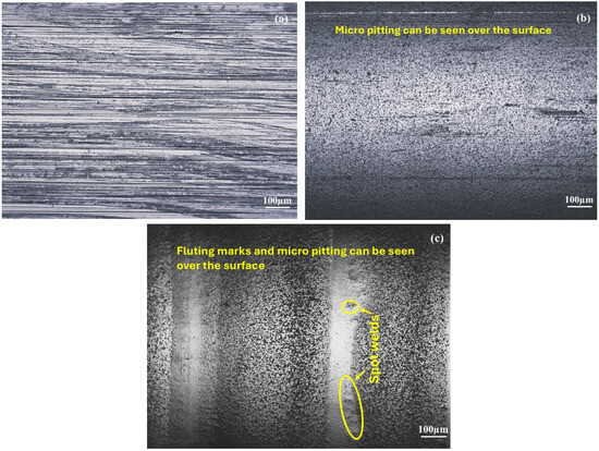Optical microscope images of bearing raceway indicating failures. (a) Fresh bearing; (b) bearing raceway after the test with Grease 1 with micro pits; (c) bearing raceway after the test with Grease 2 with micro pits and fluting marks.