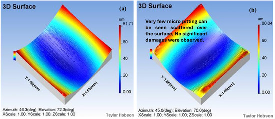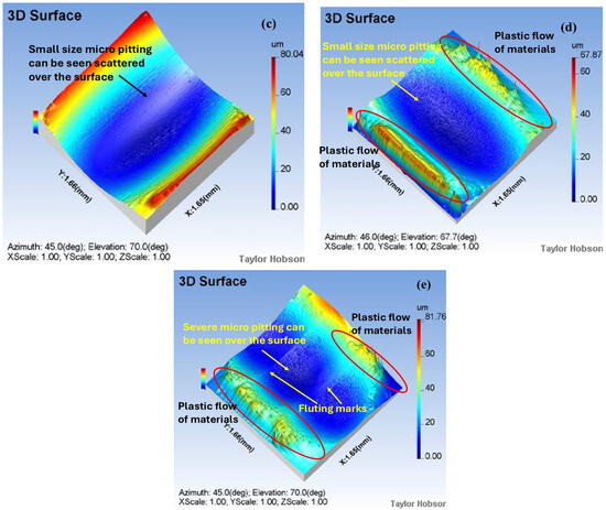 Figure 9 exhibits the micro-pitting formation, fluting marks formation, and spot welds on the bearing raceways. Figure 9a exhibits the fresh surface of the bearing raceways before the test. The three-dimensional images from the profilometer indicate a few micro-pittings on the bearing raceways (Figure 9b,c), which were tested without the current. As indicated earlier, the degradation of the lubricant due to the passage of current would result in localized heating [56]; hence, excessive plastic deformation can be seen along the sides of the raceways (Figure 10). The localized spot welds shear under sliding, and the debris may play a role in producing the scratch marks on the bearing surfaces (three-body abrasion). The optical microscope images of the bearing raceways exhibited substantial damage with Grease 2 as compared to Grease 1, making a strong point of a stable lubricating film by Grease 1.