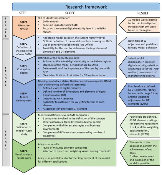 The applied research methodology is divided into three main stages: systematic literature review, definition and development of the model, and validation of the new model to assess the digital maturity level. The research framework is shown in Figure 1.
