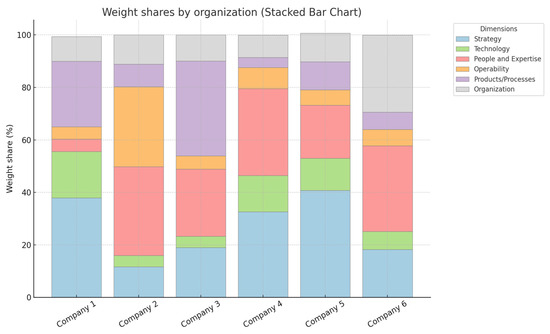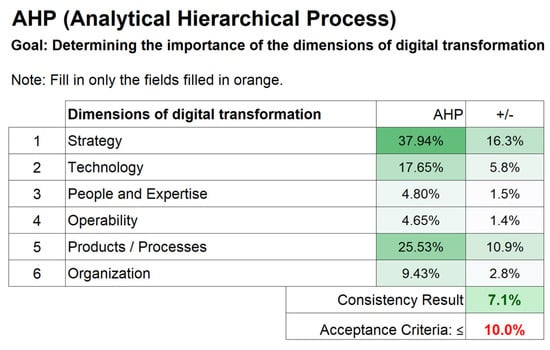 The approach used is based on an open version of the AHP method, which has proven to be particularly suitable in previous studies conducted in collaboration with industry experts due to its transparency, ease of implementation, and adaptability [68,69]. An example of practical results illustrating the weighting factors assigned to each dimension can be found in Figure 3.