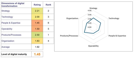 Taking into account the average level of digital maturity in the Balkan region, the model was defined with four maturity levels (Table 1). The usually used fifth level—innovation maturity—was deliberately not considered in this phase. This decision reflects the significant gap between the current maturity level and the desired fifth level, which is associated with readiness for Industry 4.0. The exclusion helps avoid user discomfort, demotivation, and unnecessary spending on unachievable goals in the early stages of DT. The four-level structure is designed to maintain motivation and ensure that maturity assessments remain both realistic and practical.