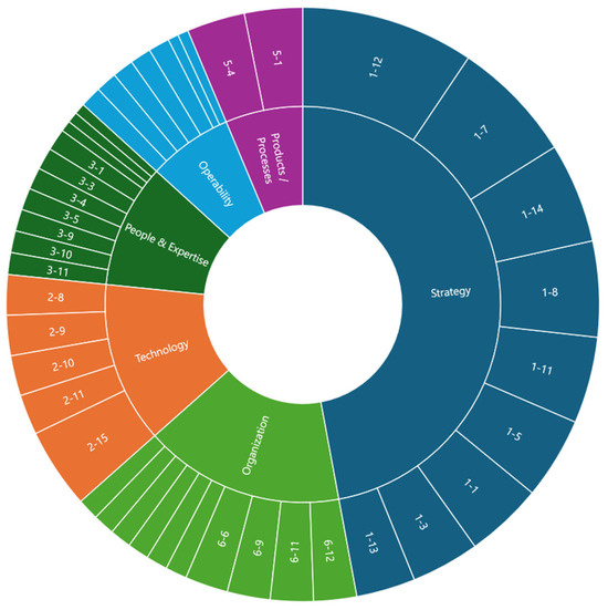 In the initial phase, a total of 86 DT elements were identified. After a comprehensive assessment and several rounds of expert consultations, this number was reduced to 66 elements spread across six key dimensions of the model. The number of elements within the dimensions varies, from five in the Products and Processes dimension to fifteen in the Technology dimension, which was recognized as the most sensitive and influential component for the successful implementation of DT initiatives [27].
