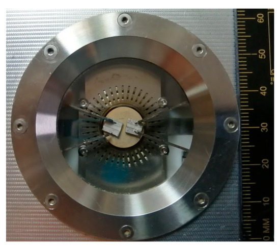 The gas sensing measurements of the samples were performed by means of a sealed chamber with a Nextron MPS-CHH microprobe station. The chamber volume was 100 cm3. A ceramic-type heater, installed in the chamber, was used to heat the samples. The heater allowed T to be set and controlled in the range from RT to 750 °C with a T accuracy control of ±0.1 °C. The gas mixture of pure dry air + CH4 was pumped through the measuring chamber. The pure dry air was generated using a special generator GPA-1,2-3,5 (Himelektronika LLC, Moskow, Russia) that produces air with a residual concentration of moisture and hydrocarbon contaminants of no more than 10 ppm and 0.1 ppm, respectively. The concentration of the CH4 in the gas mixture was controlled by a gas mixing and a delivery system Microgas F-06 (MICROMED S.r.l., Roma, Italy) based on the Bronkhorst gas flow regulators. The total flow rate of the gas mixture through the measuring chamber was 1000 cm3/min. The relative error of the gas mixture flow rate did not exceed 1.5%. Figure 1 shows a photo of the samples with Pt contacts in the measuring chamber.
