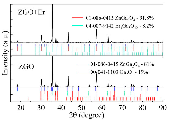 The high degree of crystallinity in the ZnGa2O4 phase across both samples confirms the successful formation of polycrystalline ZnGa2O4 with a cubic spinel structure. The differences in phase composition and crystallite sizes between the pure and Er-doped samples indicate that the incorporation of erbium influences the structural and microstructural properties. The formation of the Er3Ga5O12 phase suggests a partial interaction between Er2O3 and Ga2O3 during high-temperature annealing, as confirmed by the identification of phases using the ICDD database. These results demonstrate that both the ZGO and ZGO+Er samples possess desirable structural qualities, making them suitable for potential applications in optical and electronic technologies.