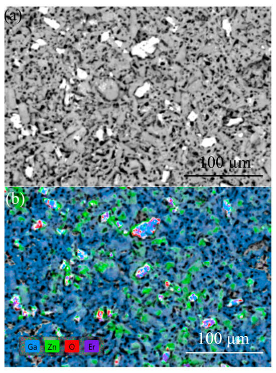 There are difficulties in determining the concentration of constituent elements in the samples due to the overlap of Ga and Zn lines on the one hand, and the insulating properties of the samples at RT on the other hand. The EDX analysis of the ZGO samples did not reveal the presence of extrinsic elements other than Ga, Zn, and O, which are homogeneously distributed over the area. EDX analysis showed that the second-type microcrystals for ZGO+Er samples (Figure 6) are characterized by a high Er content. The concentration of Er in these microcrystals exceeds the concentrations of Ga and Zn. Based on the XRD and EDX results, it can be assumed that microcrystals of the second type correspond to the superstoichiometric Er3Ga5-xO12-y phase.