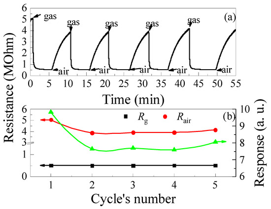 After the first cycle of CH4 exposure, the response of the samples drops by a factor of 1.28, mainly due to the decrease in Rair caused by the prolonged recovery of the sample’s resistance (see Figure 11b). It is worth noting that Rg under the above conditions is practically unchanged and varies in the range of (5.06–5.14) × 105 Ohm.