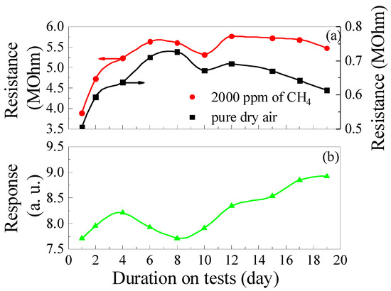 According to refs. [66,67], S ~exp(eφs). The mechanisms of the gas-sensitive characteristic drift of MOSs gas sensors are considered in ref. [79]. Operating sensors at high temperatures and under the exposure to CH4 over a long period can cause structural transformations, changes in microcrystal size, and the poisoning of the sample surface. As a result of these processes, Ni can change. Other processes, such as phase transformations, the formation of electrically active defects, and bulk diffusion, primarily result in a change in Nd. According to our results (Figure 13), an increase in base resistance and response to CH4 indicates an increase in the Ni2/Nd over the duration of the tests. We believe that, as the test duration increases further, the characteristics will continue to stabilize, as is typical for MOSs gas sensors [79].
