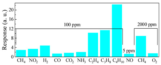 The results of the selectivity evaluation for the ZGO+Er samples at T = 650 °C are shown in Figure 14. The resistance of the samples dropped under exposure to H2, CO, CO2, NH3, and hydrocarbons, while the resistance of the samples increased under exposure to NO2 and O2. The ratios of the ZGO+Er samples’ responses to other gases and CH4 at same gas concentration of 100 ppm are presented in Table 4. As can be seen, the responses to NO2, H2, and hydrocarbons outperform those to CH4. The samples showed a particularly high response when exposed to hydrocarbons (C2H4, C3H8 and C4H10). A noticeable response to NH3 was also obtained. For the remaining gases CO, CO2, and O2, the responses were low. The response to 5 ppm of NO was 1.22 a.u.