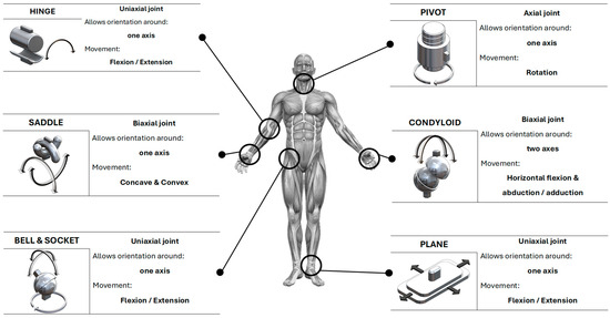 A joint is a point where two skeletal elements come into contact [19], allowing movement between them. Joints are essential for mobility and the function of the musculoskeletal system in the human body. There are different types of joints, classified based on their structure and the amount of movement they allow. The main categories of joints are fibrous, cartilaginous, and synovial [19]. Fibrous and cartilaginous joints allow very limited movements, such as those of the skull or the vertebrae in the spine, as they are connected by fibrous connective tissue and cartilage, respectively, while synovial joints are formed by a joint capsule, synovial fluid, and articular surfaces covered with cartilage, such as the knee [19]. Considering that fibrous and cartilaginous joints have very limited movements, they can be considered as fixed or low-mobility joints, while synovial joints allow a wide variety of movements.