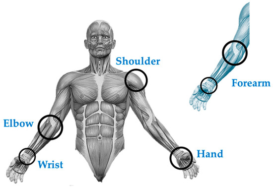 In Table 1 and Figure 2, the distribution of joints throughout the body and their additions, such as the forearm, can be seen. This refers to the movement of the musculoskeletal system, which is essential for the development of technological devices for joint assistance, in this case, synovial joints. By locating the joints, biomechanical analyses can be made, which are useful for calculating ideal trajectories for improvements in assistive devices. Table 2 describes the joints of the upper limb, considering their axes as degrees of mobility and their biomechanical description.