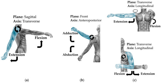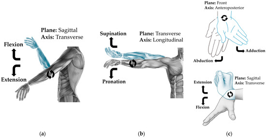 Movements of the elbow, forearm, and wrist: (a) movement on the transversal axis; (b) movement on the longitudinal axis; (c) movement on the anteroposterior and transversal axes.
