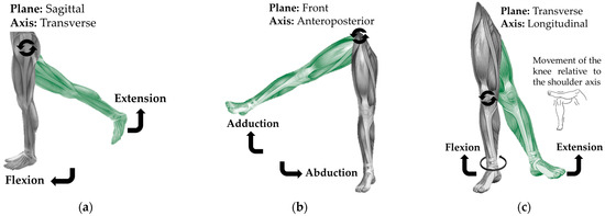 (a) Knee movements around the transverse axis; (b) ankle movement; (b) movement around the transverse axis; (c) movement around the anteroposterior axis.