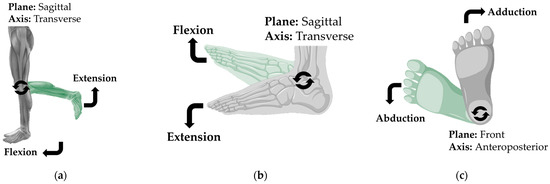 From Table 1, the joints of the upper limb and their pronosupination were taken as the basis, and in the same table, the joints of the lower limb are described. Like the previous joints, these are analyzed to calculate ideal trajectories for improving assistive devices. In Table 4, the joints of the lower limb are described, considering their axes, degrees of mobility, and biomechanical description. Given that the information collected for joint movements is extensive, the joints, degrees of freedom, axes, planes, characteristic movements, and illustrative references will be described in independent figures (Figure 6 and Figure 7), as their descriptions cannot be clearly distinguished within the space provided in the table.