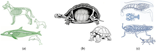 Based on Table 10, the origin of the word “exoskeleton” comes from zoology, describing a hardened structure, mostly of bone nature [27]. In Table 7, it is defined as a hard layer that covers, supports, and protects an invertebrate biological being, which uses the external skeletal structure to support, move, and protect itself [37]. Therefore, an exoskeleton is used for invertebrates, in contrast to vertebrates, which possess an internal skeletal structure called an endoskeleton (Figure 8a). Humans, as well as terrestrial, aerial, or marine animals, have both endo and exoskeletons, and the variety is finite and can be distinguished by their visible characteristics. However, there are animals where the difference is not so clear, such as the terrestrial tortoises, which have both an external and internal skeletal structure (Figure 8b). Their shell and limbs do not share the same line, even though their limbs have an internal bone structure, the containment of their organs is under an external bone structure, making them a hybrid in terms of skeletal composition. This composition is artificially represented when a mechanical structure is placed around a vertebrate.