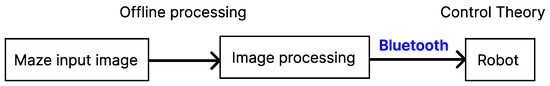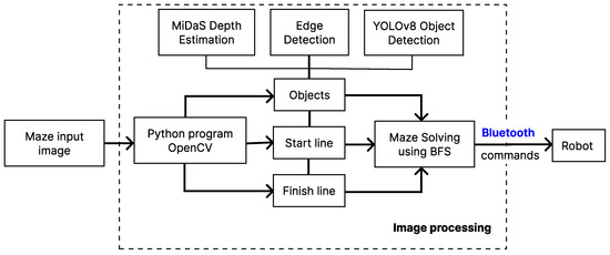 In Figure 2, the initial block diagram was refined to provide a more detailed and structured representation of the image processing component. This extended view outlines the sequence of operations required to extract relevant information from the maze image. The process includes the identification of key visual features, such as the maze boundaries and the navigable path between two designated points. These features are isolated through a series of pre-processing and analysis steps designed to simplify the image and emphasise structural elements. Once the relevant data has been extracted, it is processed and formatted to be transmitted to the robot’s control system, facilitating accurate and autonomous navigation within the maze.