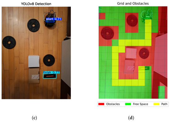 Subsequently, a uniform grid was overlaid onto the processed image as illustrated in Figure 3d to discretize the maze into smaller, manageable sections. Each cell of the grid was then analyzed individually to determine the presence of objects. This objective was realized through the creation of masks derived from the identified contours of objects. The initial and final areas were excluded by detecting them using the trained neural network. In this manner, each obstruction was meticulously examined to ascertain its alignment with either a start or finish line. As a result, a binary maze matrix was generated, where cells corresponding to obstacles were assigned a value of 1, while all other cells (indicating free space) were assigned a value of 0. This matrix served as a simplified digital representation of the maze layout, providing a foundation for subsequent path-planning and navigation algorithms.