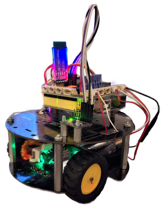 The robot is a simplified version of a Turtle robot described by [14] and is built around an Arduino Uno board equipped with an L298P motor driver shield, as shown in Figure 5. This mobile robot originally had two motors, which were replaced with new motors that include integrated encoders for improved position and speed feedback. One of the motors features a maximum speed of 155 RPM with a 100:1 gear ratio, while the other motor has a maximum speed of 105 RPM with a 150:1 gear ratio. An MPU6050 gyroscope sensor was integrated into the robot’s hardware configuration to facilitate the execution of one of the planned experiments. Furthermore, the original Bluetooth module was substituted with an HC-05 module, which facilitated stable wireless communication and allowed for a seamless connection to a laptop.
