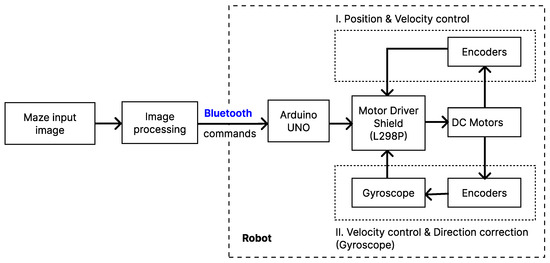 As illustrated in Figure 1, the system involves uploading an image of a maze into a Python 3.13.2 script, where offline processing is performed to identify the objects and determine a path from a specified starting point to a selected endpoint. This computed path is then transmitted to the robot via Bluetooth communication. To enable the robot to navigate through the maze, control theory principles were applied to design both position and velocity controllers, which resulted in significantly improved accuracy during movement execution. The following subsections will offer a detailed explanation of each component illustrated in this diagram.