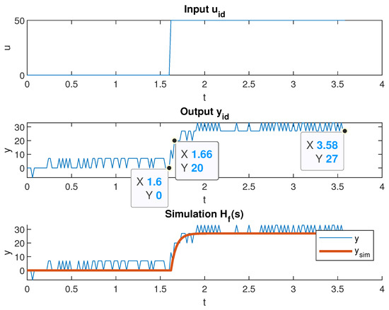 where the counter denotes the number of encoder pulses recorded during a predefined sampling interval ( s). This computation enabled the transformation of discrete pulse counts into continuous speed measurements, which were subsequently used to generate the motor’s output velocity graph. In addition, the system identification procedure is described, where the motor’s dynamic behavior was approximated by a first-order transfer function model. This simplified representation captures the essential characteristics of the motor response and serves as the foundation for designing effective control strategies.