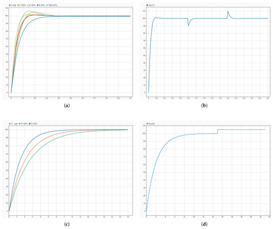 For the outer loop, the robustness was tested by modifying the time constant of the fixed part by ±30%. Again, no significant changes were observed in the system behavior. The results are presented in Table 2 and depicted in Figure 11c. Regarding the outer loop’s disturbance response, a step disturbance of amplitude was applied at the system output. As seen in Figure 11d, the system did not reject the disturbance but rather accumulated it. However, applying a disturbance of the same amplitude but with the opposite sign would result in disturbance elimination.