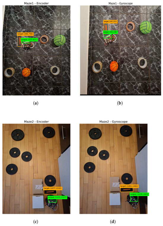 Figure 12 and Table 5 present an analysis of positioning errors in the two maze scenarios, using both the encoder-based and gyroscope-based methods. The error values are estimates and cannot be considered exact measurements as they are calculated as the Euclidean distance between the center of the start line and the center of the finish line. Discrepancies may arise between the actual distances and those computed from the images due to the camera’s angle of inclination. Additionally, as the start line is not located precisely at the edge of the robot, the values may appear slightly larger than the actual distance between the robot and the line. An accumulation of errors can be observed in both cases, especially in the second test where the path is longer. Nevertheless, the robot manages to reach the target relatively close in both situations. These experiments highlight that the two navigation strategies have comparable path deviations, with similar error magnitudes.