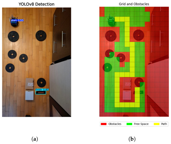 Following the completion of the initial processing steps, the focus transitioned to the identification of the start and finish lines within the maze environment. The start line was implemented as a green strip physically attached to the robot, serving as a visual cue to facilitate its identification within the scene. Conversely, the finish line was designed as an orange strip placed over a black background in order to enhance its visual prominence and ensure reliable recognition. In view of the distinct and consistent visual properties of both the start and finish lines—specifically, their unique colour and placement—it was deemed appropriate to employ a deep-learning-based approach for robust detection. In order to achieve this objective, a pretrained object detection model, YOLOv8, was selected on the basis of its proven efficiency and accuracy in real-time applications. The training process involved the manual annotation of 500 images containing start and finish lines. These images were captured under a variety of conditions, including different viewing angles, varying lighting environments, and diverse room settings. These annotations enabled the model to acquire generalized representations of the lines. The dataset was partitioned into 80% training data and 20% validation data to ensure both learning and generalization were adequately addressed.