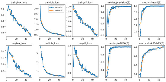 A YOLOv8 network was trained to detect the start and finish lines, and its performance is illustrated in Figure 15. The model’s performance was evaluated based on the progression of training losses and detection metrics. Training losses decreased gradually and remained stable throughout the epochs, indicating effective learning without overfitting. In terms of evaluation metrics, the model achieved high precision, recall, and mean average precision (mAP) scores on the validation set, demonstrating its ability to detect and correctly classify target objects. Overall, the model shows good generalization and is well suited to the task.